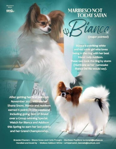 Welcome to the 'In The Ring' page of WhisperWind Papillons, where we showcase our successes in the show ring. As an exhibitor of Papillons in Canada, we take pride in presenting our championship-worthy dogs to the world.